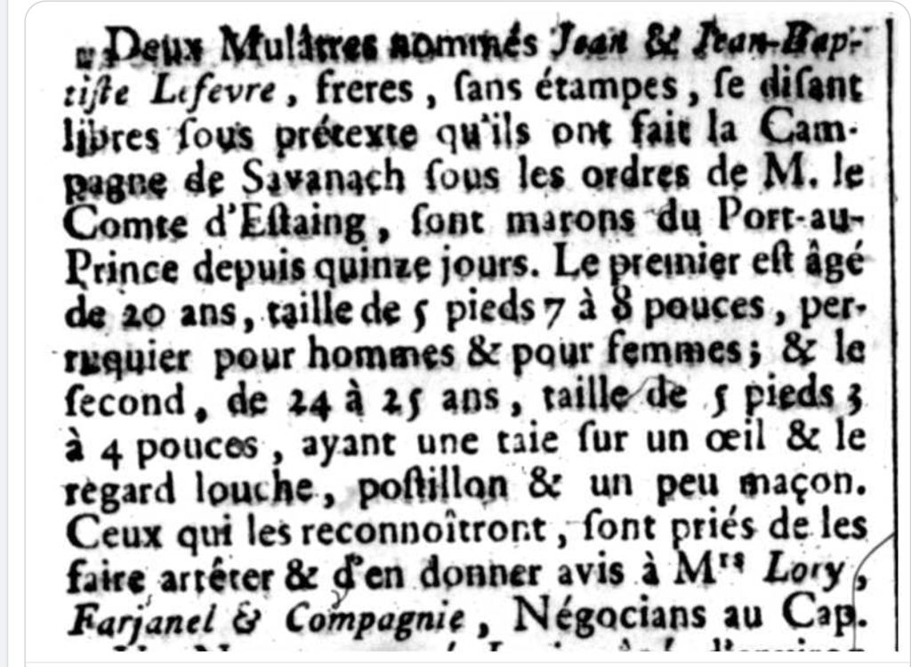 30 Jiyè 1783, nan Affiches Américaines (de Saint-Domingue), nou jwenn piblisite yon kolon ki bezwen re-kenbe 2 nèg mawon li presize se 2 nèg k ap mache pran pòz yo lib sou pretèks yo te fè lagè nan Savana, pou Etazini ak Lafrans. Natirèlman blan malveyan yo te pèmèt yo alepòk pou yo rele nèg manman osnon grann yo te sibi kadejak anba zago kolon esklavajis yo tout kalite non, selon ki pousantaj “san” blan yo sispèk k ap kouri nan venn yo. Yo te deklare 2 nèg sa yo kolon malveyan yo t ap chèche a de (2) “milat” – sa vle di: 2 mwatye lòm (mwatye blan).